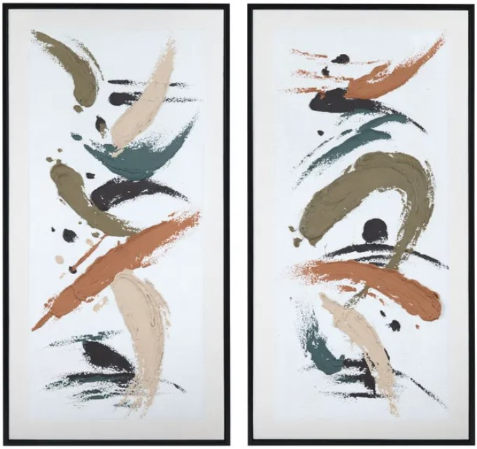 The Crestview Collection Calliope wall art set features a pair of modern abstract paintings with bold, textured brushstrokes in earthy tones of rust, beige, olive, and black on a crisp white background. Framed in sleek black frame, this set adds a contemporary artistic touch to any living space, office, or hallway.Read More
