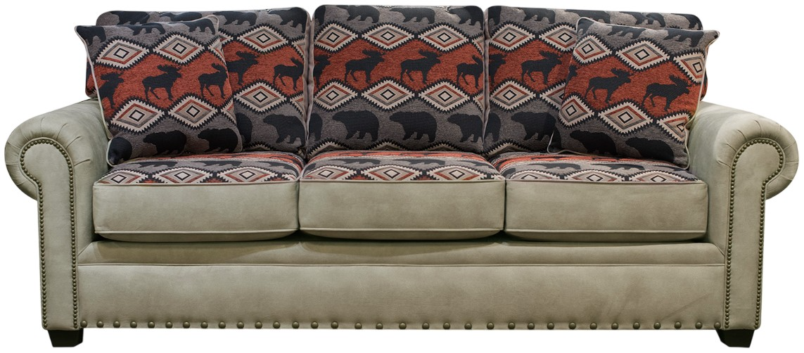 The lodge look is alive and well in our Jaden group. A three cushion style in married fabrics with pyramid legs and rolled and welted arms. Toss pillows are reversible. Novelty patterns combined with a leather-look fabrics provide the perfect choice for your cabin or retreat home.Read More